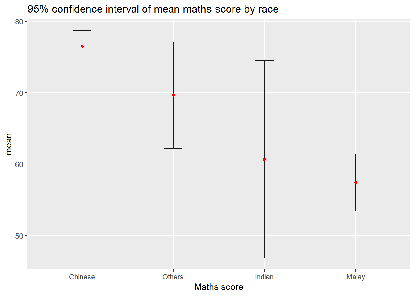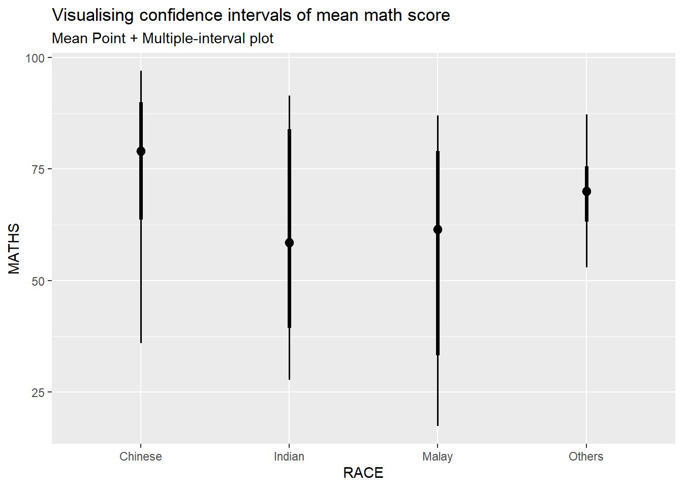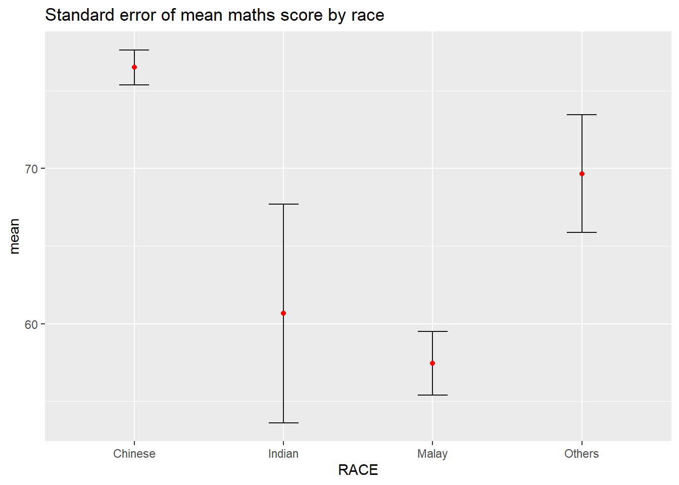 mutate(se=sd/sqrt(n-1))group_by()of dplyr package is used to group the observation by RACEsummarise()is used to compute the count of observations, mean, standard deviationmutate()is used to derive standard error of Maths by RACE, andthe output is save as a tibble data table called my_sum.