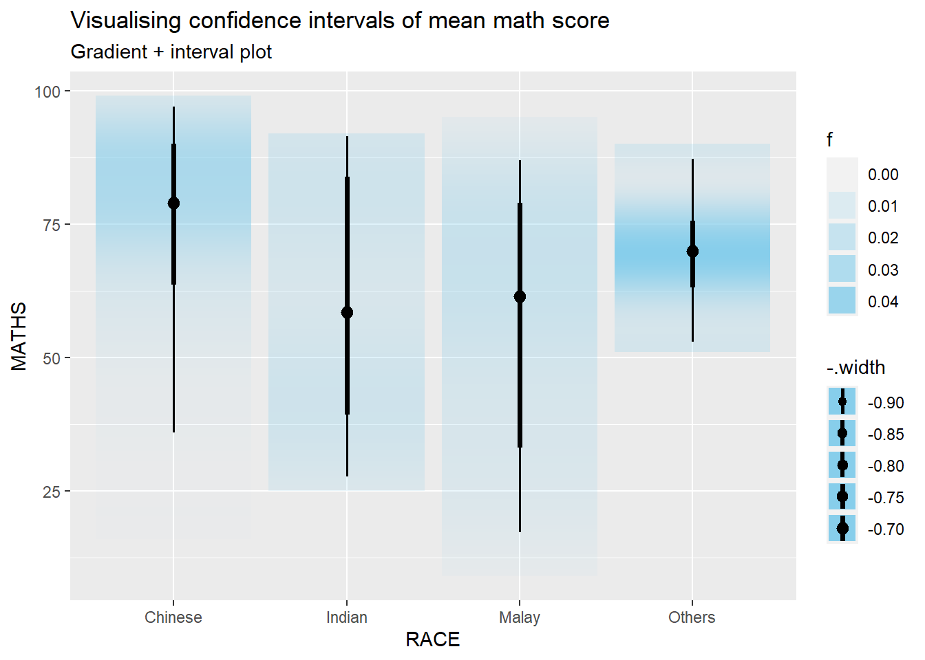 stat_gradientinterval() of ggdist is used to build a visual for displaying distribution of maths scores by race