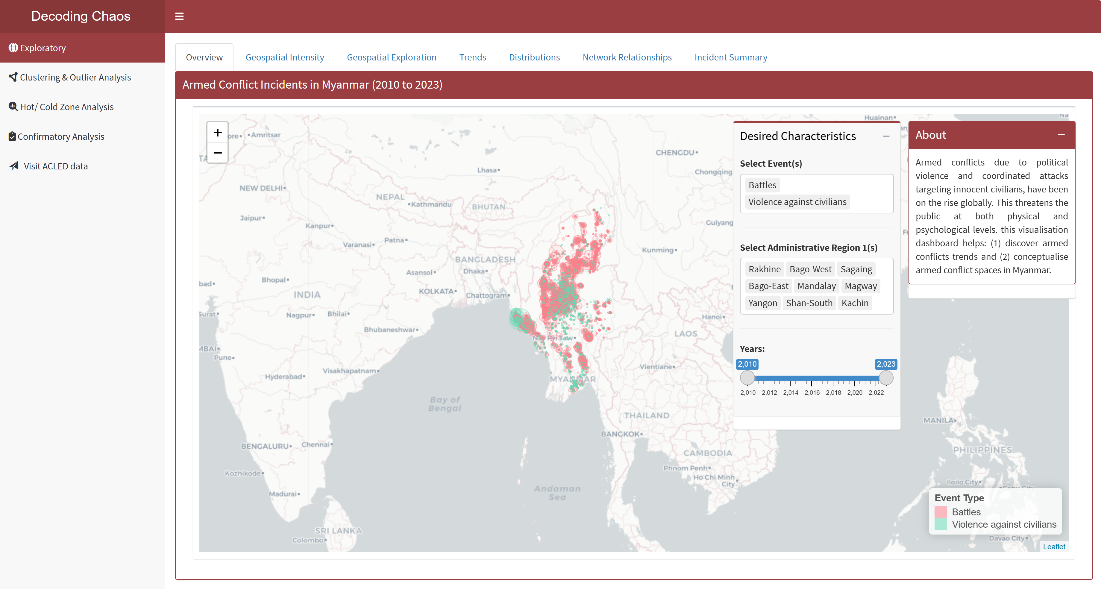 This tab serves as the “landing page” that displays the map of Myanmar and its spatial points of armed conflicts over the years (i.e. 2010 to 2023). Figure below shows the UI interactive features in the Overview sub-tab.