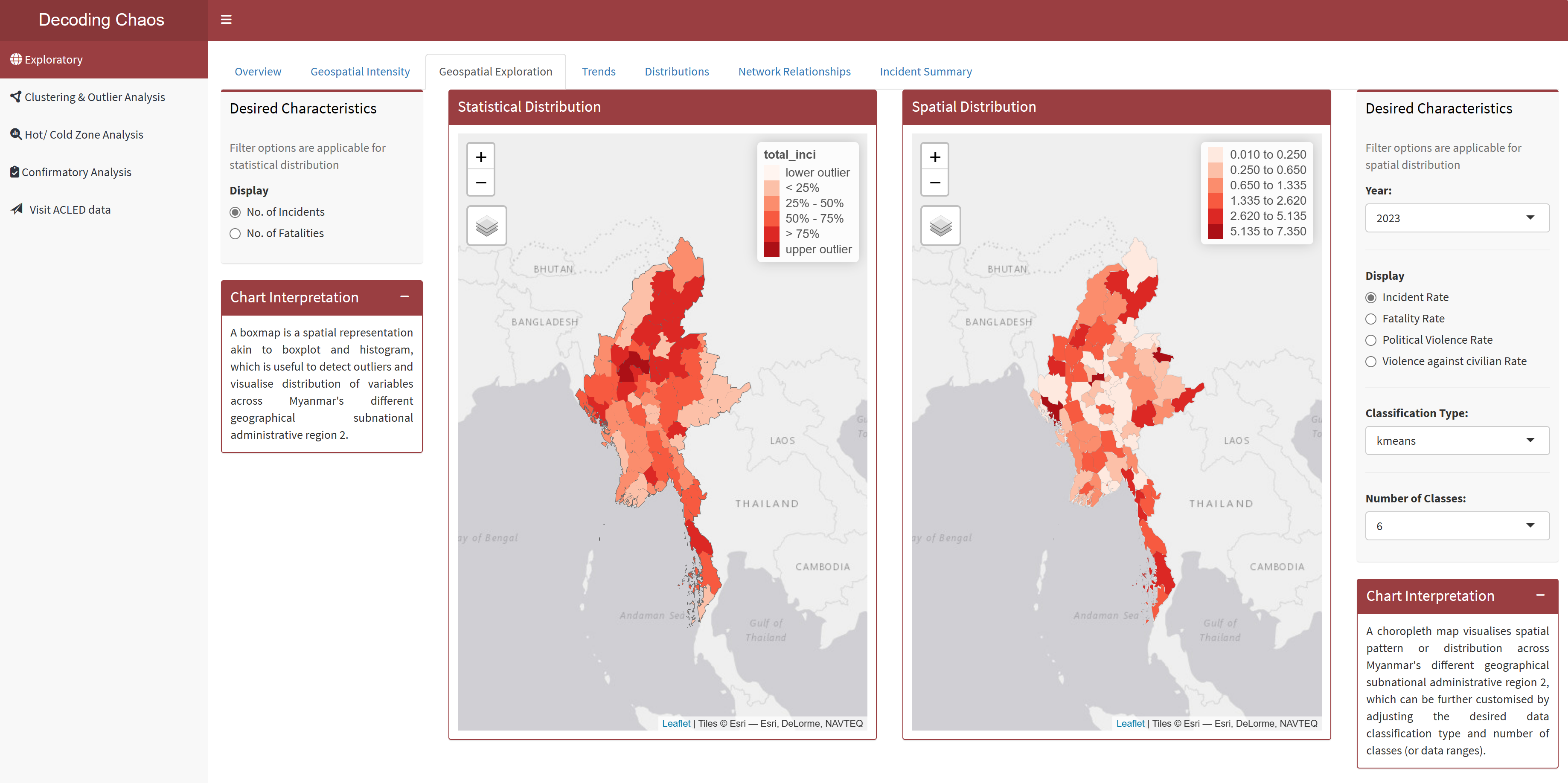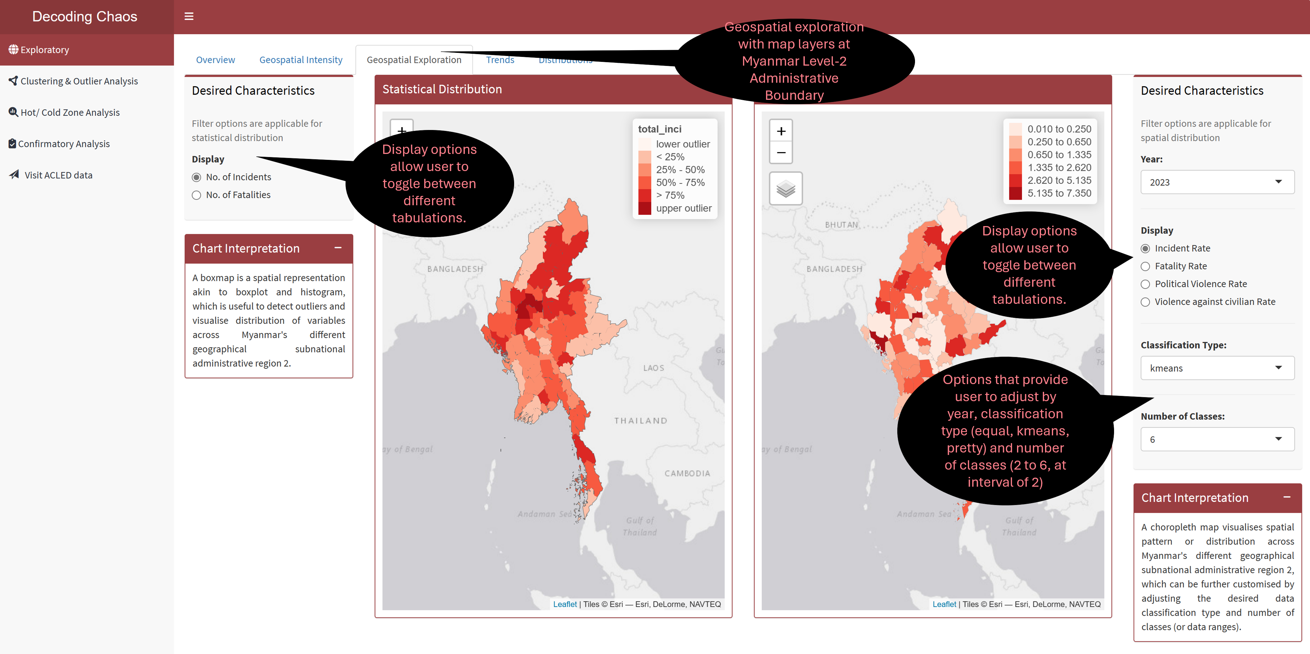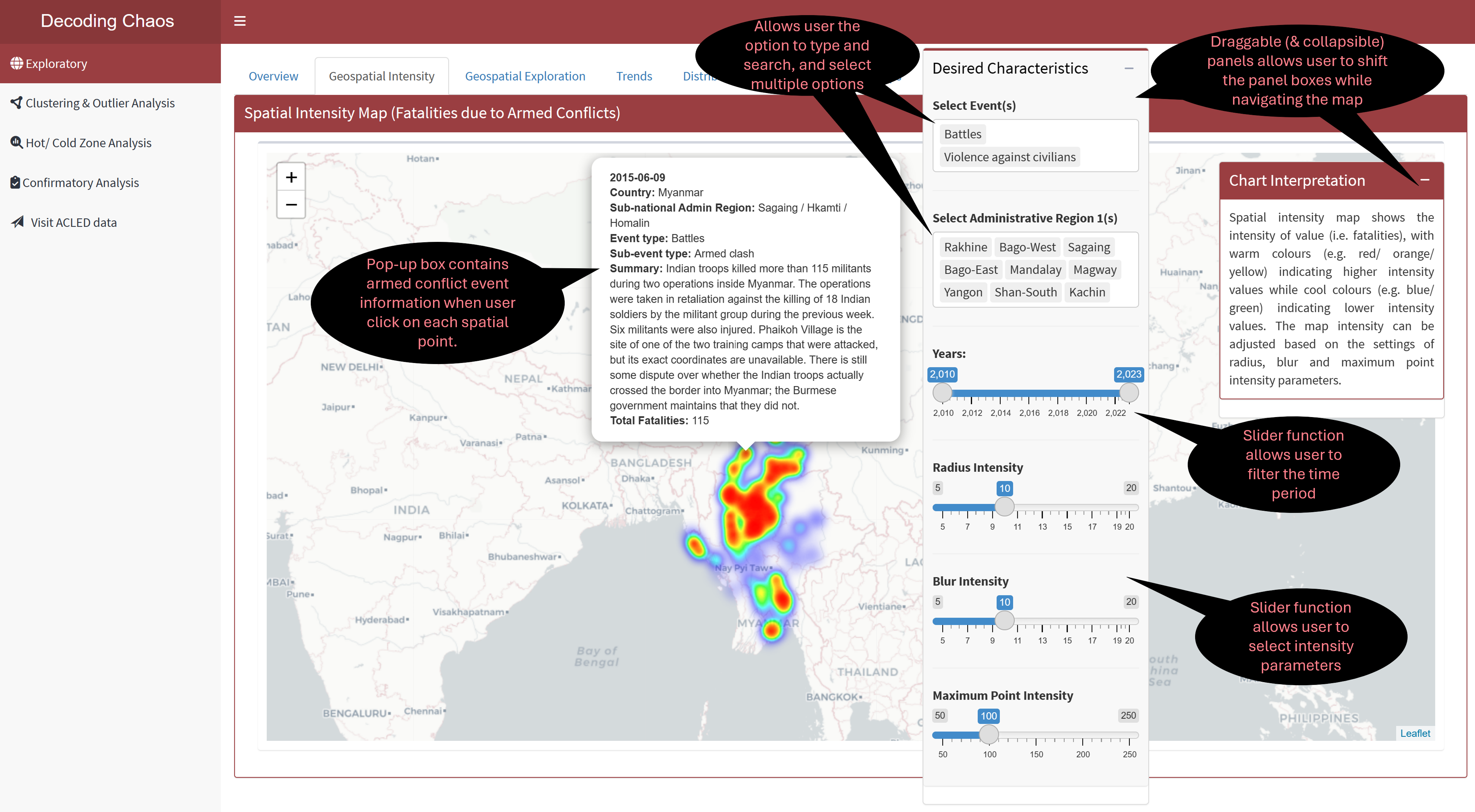 Geospatial Data Exploratory Analysis allows users to select different variables and perform spatial exploration on the dataset to conceptualise armed conflict spaces in Myanmar.