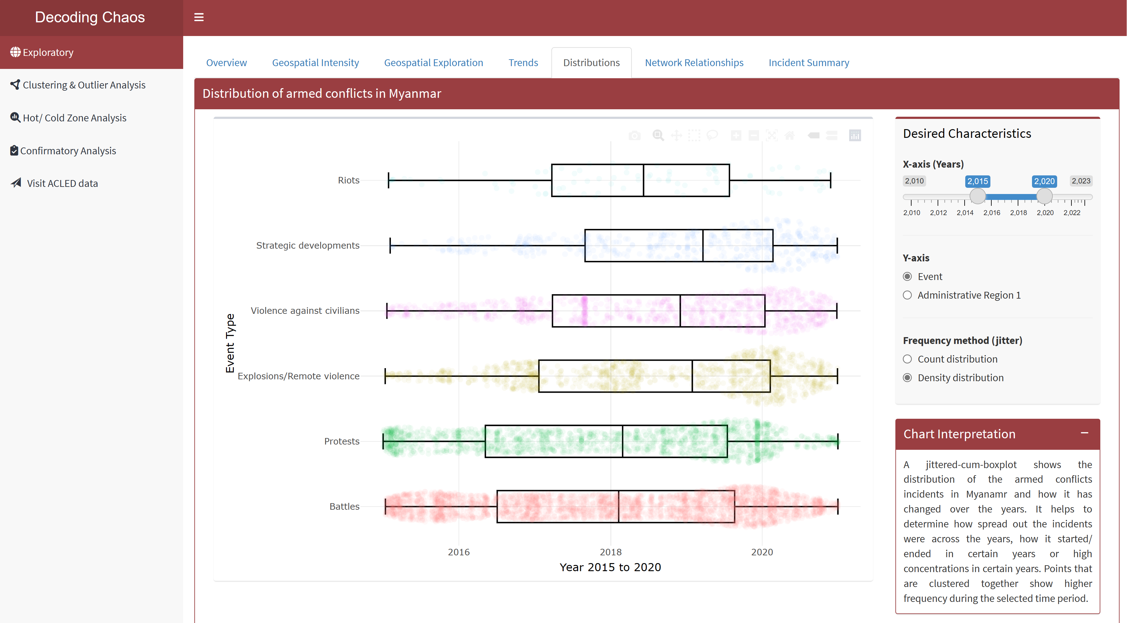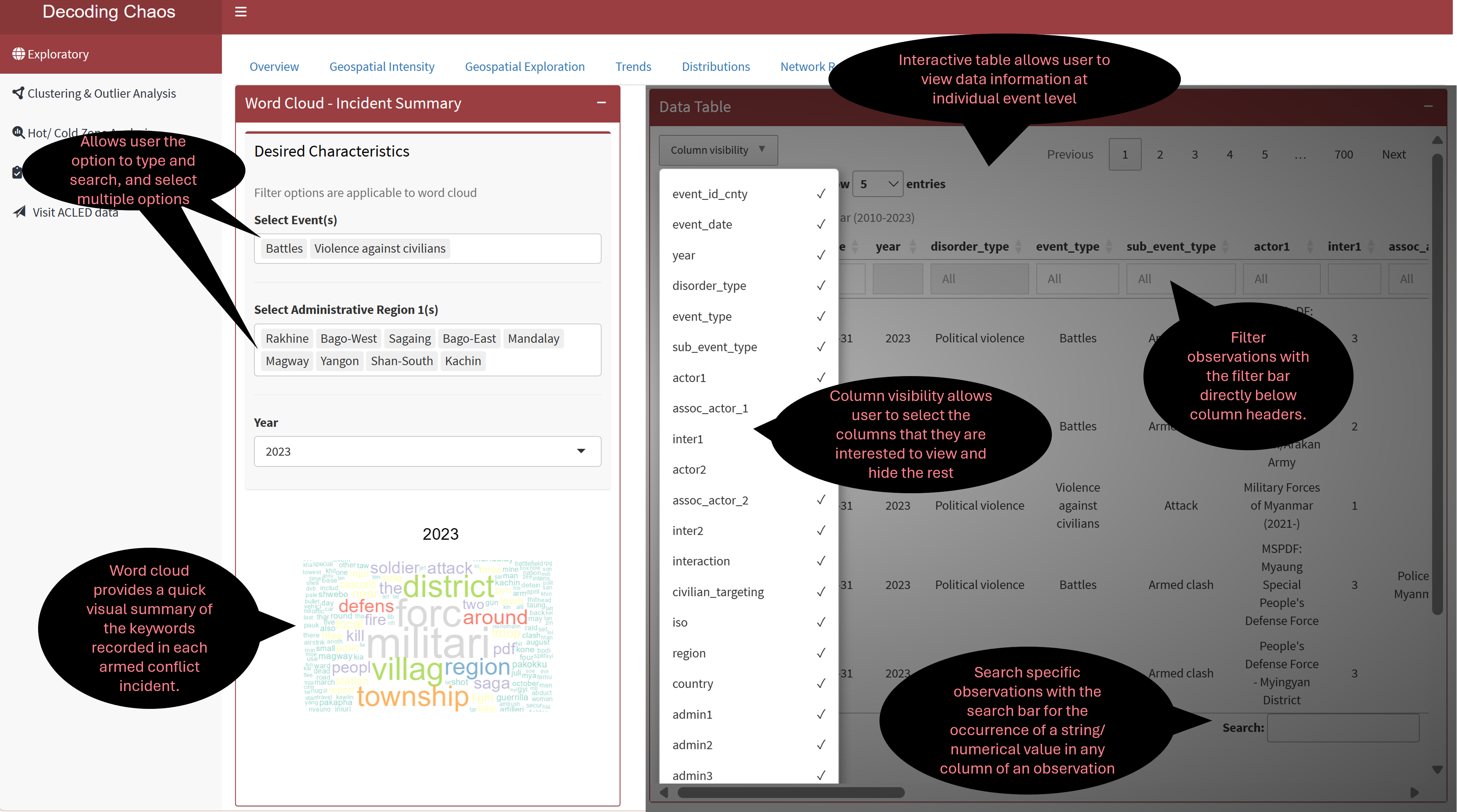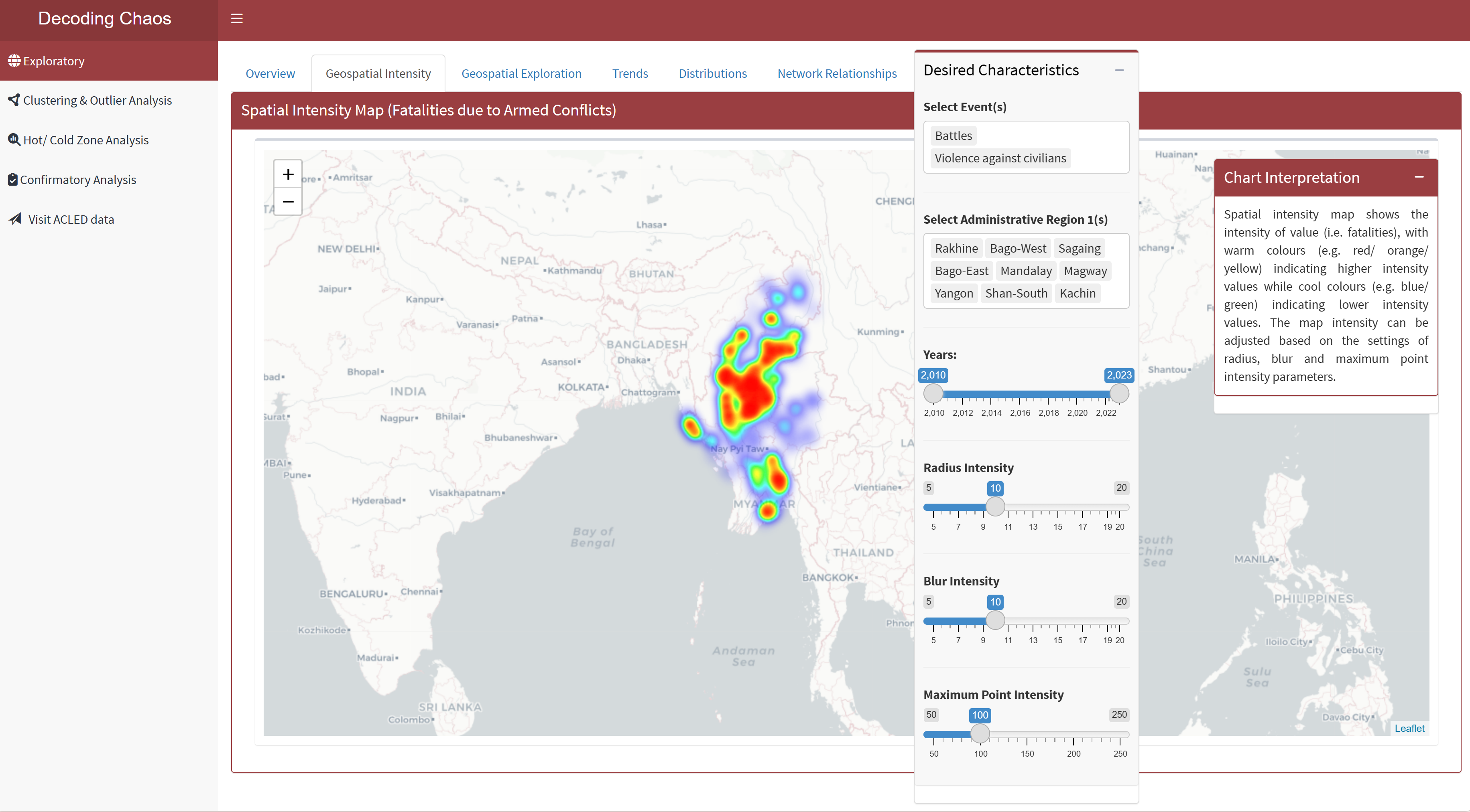 Geospatial Data Exploratory Analysis allows users to select different variables and perform spatial exploration on the dataset to conceptualise armed conflict spaces in Myanmar.