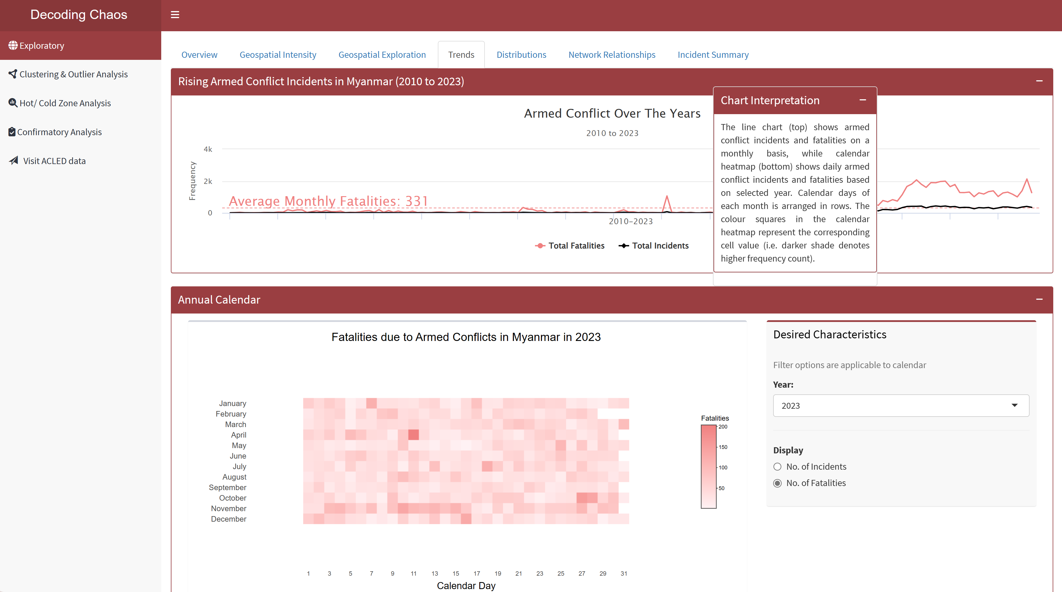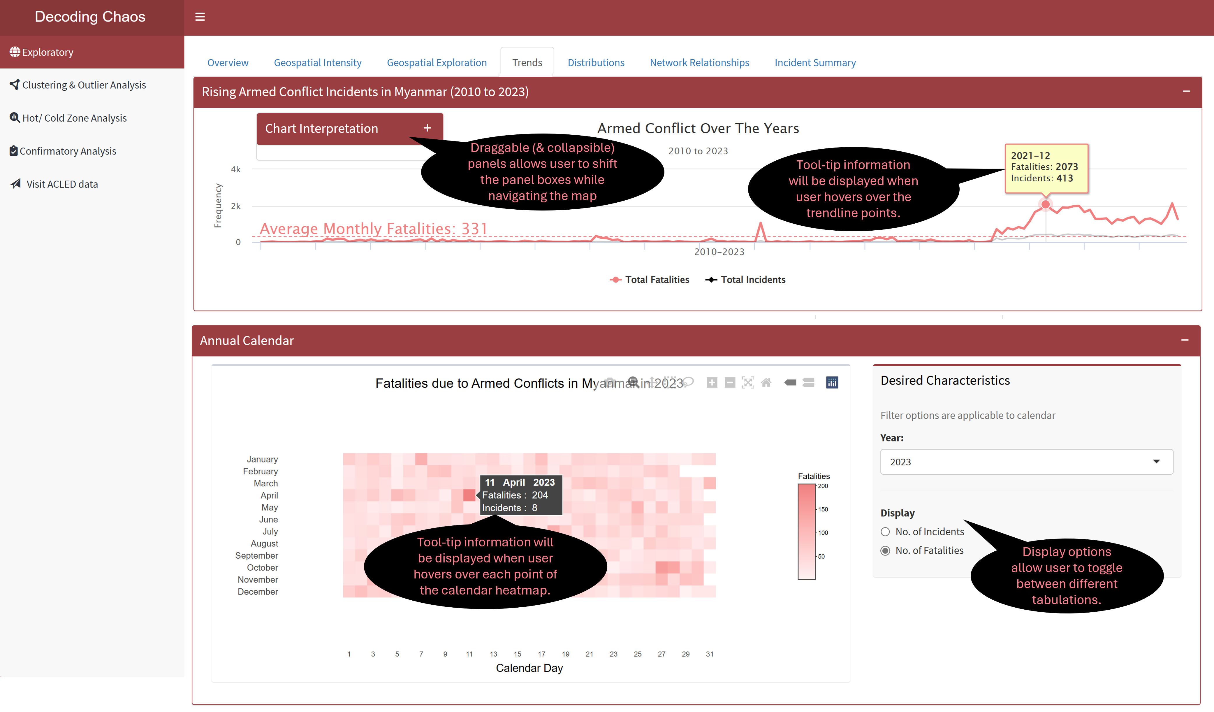 This tab allows user to perform time series analysis to identify trends, or cyclic patterns, spot anomalies, visualise distribution of armed conflict incidents/ fatalities and how it has changed over the years using either line chart or calendar heatmap. The line chart (top) shows armed conflict incidents and fatalities on a monthly basis, while calendar heatmap (bottom) shows daily armed conflict incidents and fatalities based on selected year. Calendar days of each month is arranged in rows. The colour squares in the calendar heatmap represent the corresponding cell value (i.e. darker shade denotes higher frequency count). Figure below shows the UI interactive features in the Trends sub-tab.
