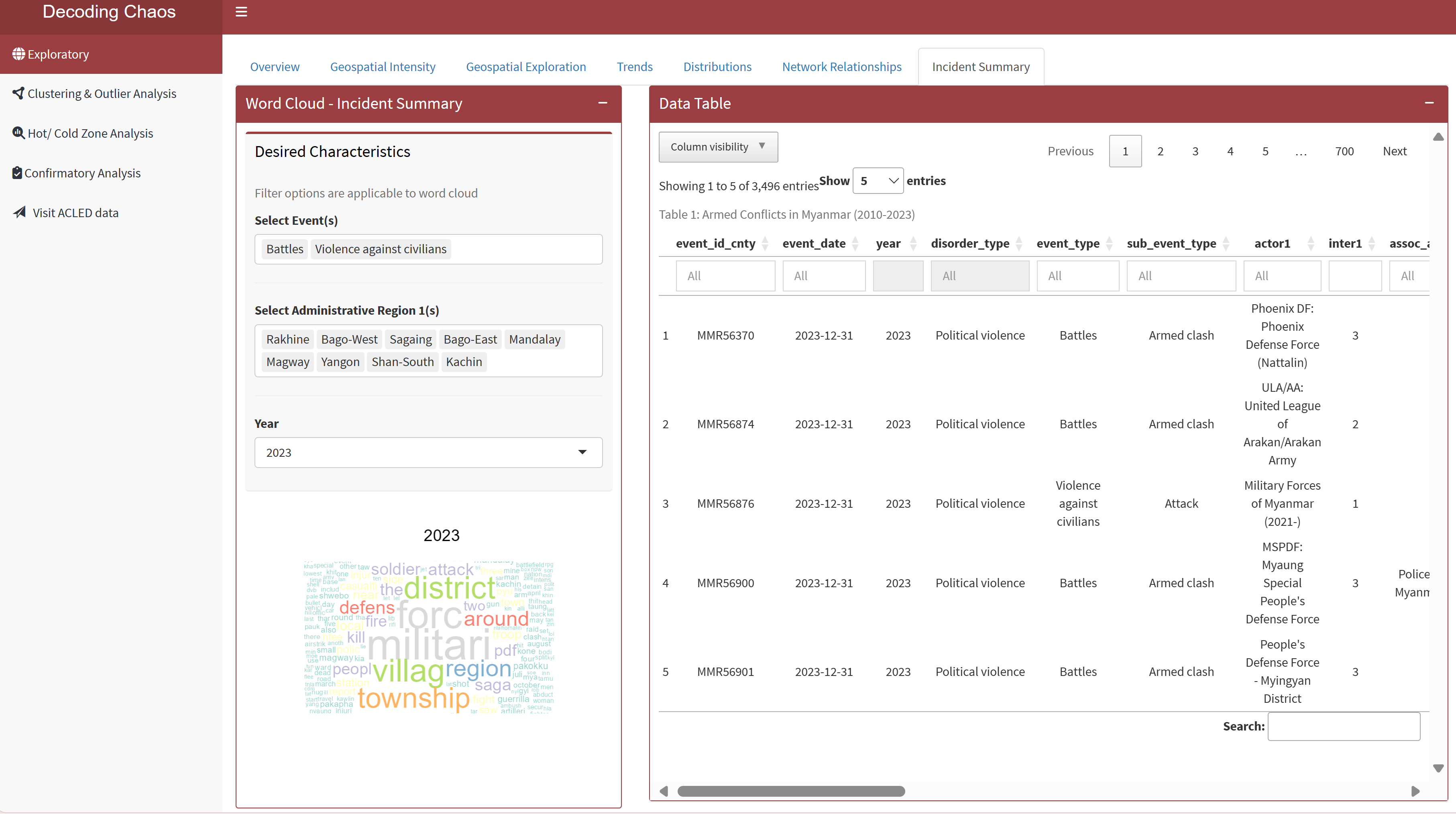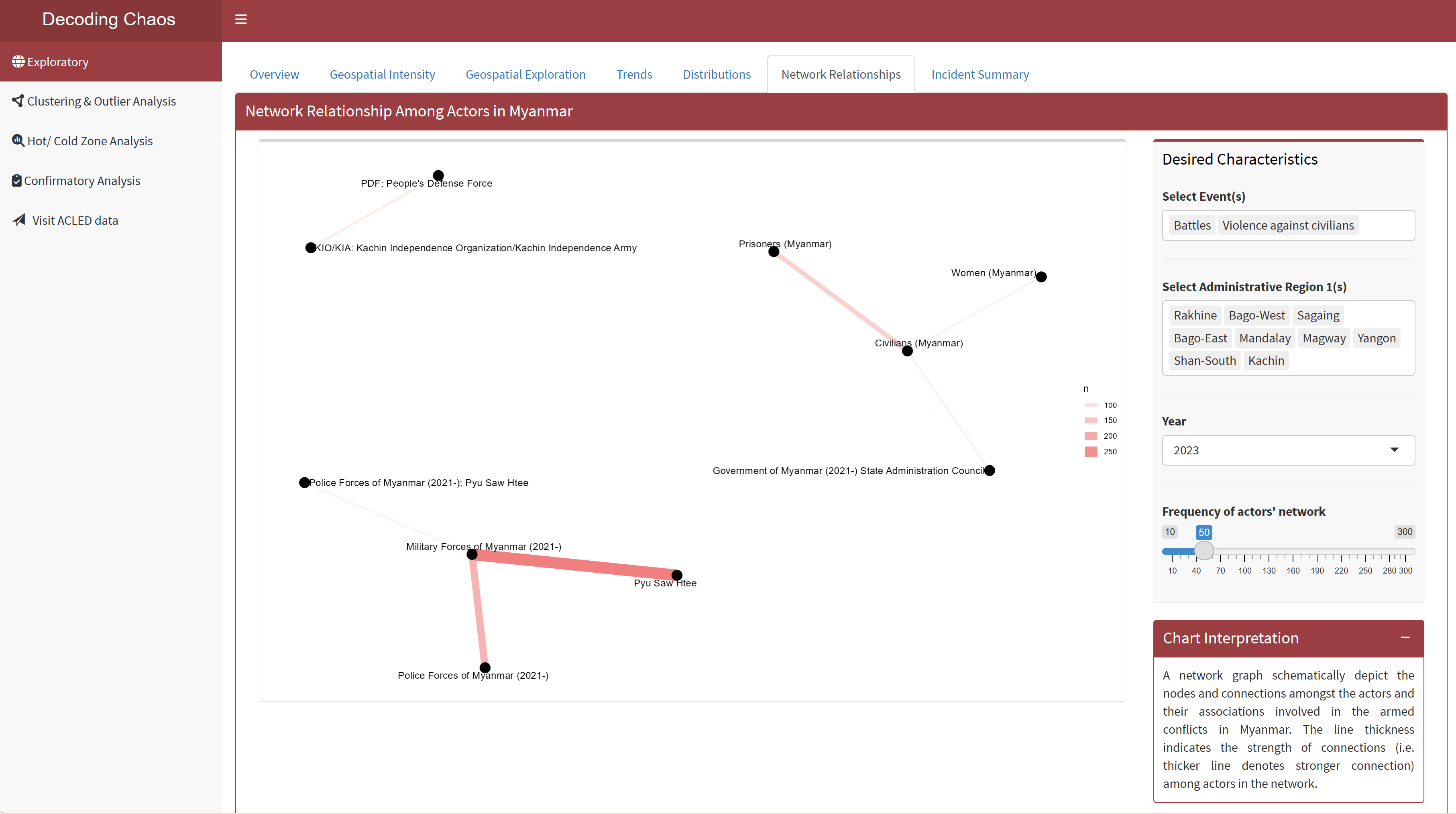 Data Exploratory Analysis allows users to select different variables and perform initial exploration on the dataset to discover distribution, trends and network relationships of armed conflicts in Myanmar.